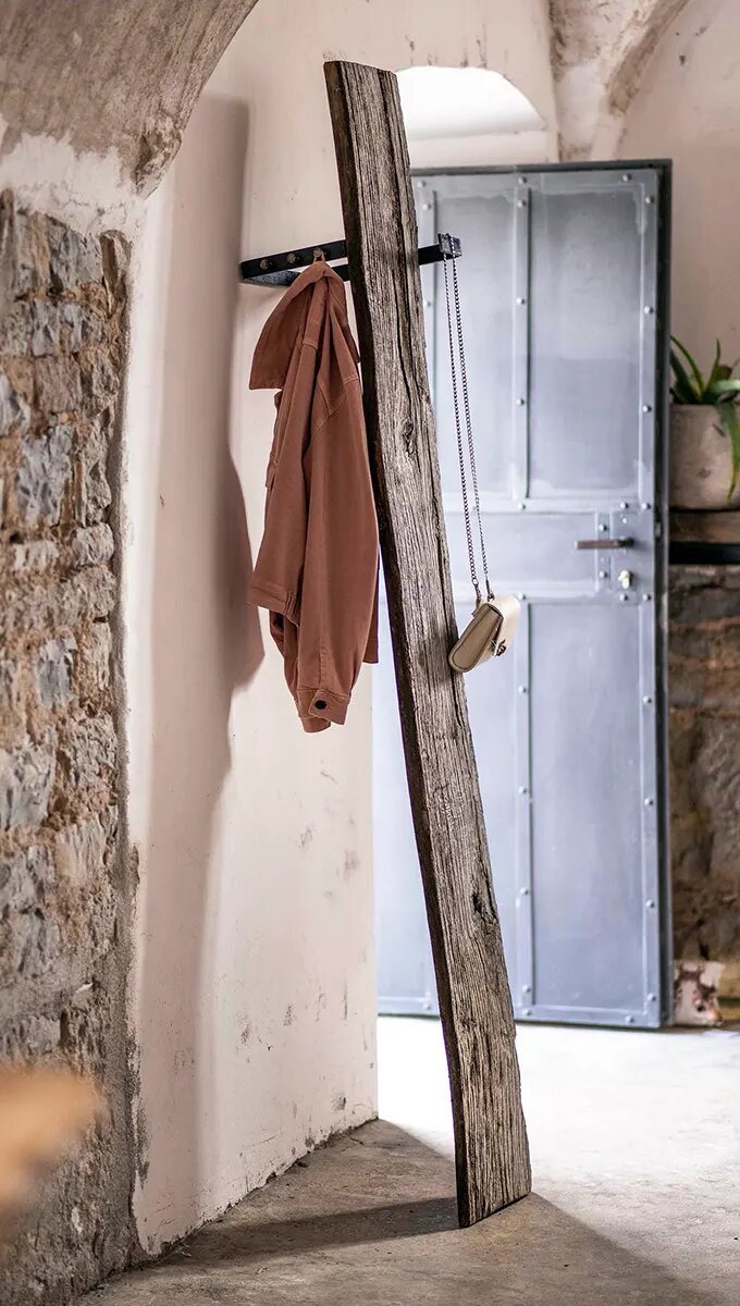 Ein Stück Natur – Unsere Garderobe besteht aus einer massiven Eichenbohle mit einer einzigartigen, charaktervoller Maserung, Astlöchern und Rissen. Dieses Möbelstück verzaubert jeden Flur oder Raum zu einem einzigartigen Ambiente.